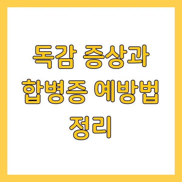 | 구분 | 내용 | | ---------------- | ------------------------------------------------------------------------------------------------------------------------------------------------------------------------------------------------------------------------------------------------------------------------------------------------------------------------- | | 독감 원인 | 인플루엔자 바이러스 | | 주요 증상 | 고열, 몸살, 두통, 기침, 인후통 | | 합병증 | 폐렴, 뇌염, 뇌수막염, 심근염 등 | | 예방 | 독감 예방접종, 개인위생 관리 철저, 면역력 강화 | | 치료 | 항바이러스제 복용 (증상 발생 48시간 이내) | | 고위험군 | 만 65세 이상 노인, 만성 질환자, 임산부, 생후 6개월~59개월 소아 |